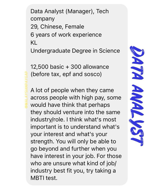 另外,一名数据分析经理分享,她本身是科学学士毕业生,拥有6年的工作经验,目前在科技公司工作,每月薪资可达到1万2800令吉。虽然拿着诱人高薪,但她鼓励大家先去了解自己的兴趣和专长,以便在职场上走得更远。