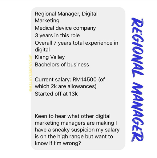 一名区域经理也透露,他的每月收入可达到1万4500令吉。这名区域经理本身拥有商业学士学位,在数码领域工作7年,目前在这家医疗器械公司当了3年的区域经理。虽然比同侪更迟开始工作,但他指出,他曾在顶尖大学念书,而且拥有3年的国外经验,懂得自己的优势所在,让他大大加速了升职加薪之路。