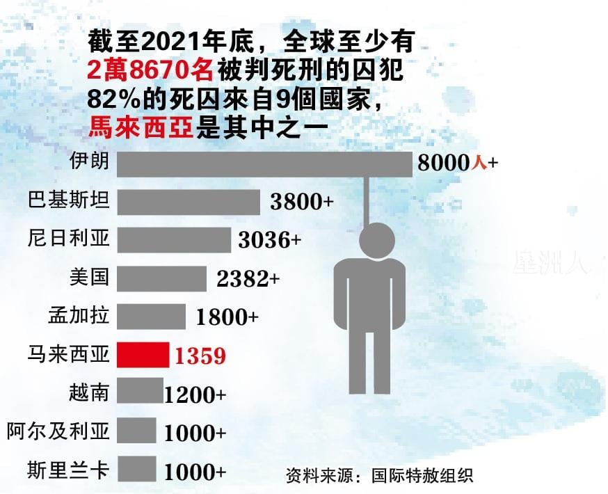 大马国际特赦组织(Amnesty)说,截至2021年底,在全球最多待处决死刑犯的国家中,大马以1359名死囚排在第6位。