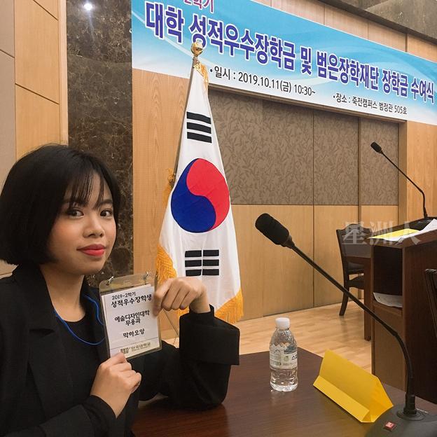 在檀国大学的4年,她的成绩一直都优秀,得过全班第一甚至全系第一,几乎每年都得到大学的全额奖学金。加上她有接一些翻译和主持活动的工作,所以在檀国大学那4年,她几乎没跟父母要过钱,不然韩国学费一年大概要三万多令吉,生活费每个月也需要大概2000令吉,而这还不包括昂贵的住宿费。