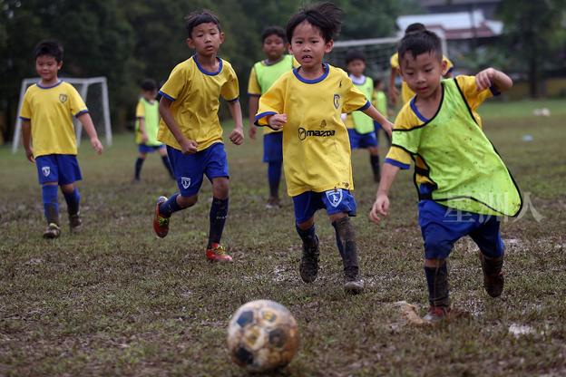 视线转移至训练场地,雨后的泥泞无阻学员的热情,他们整齐地排成一列,练习带球后射门,引起阵阵欢呼。另一组孩童围成一圈互相传球,黄伟智与其他的教练在一旁,时不时纠正他们的错误,“不要使用脚尖传,要习惯使用脚板内侧控制。”这也是初学者最容易犯下错误。