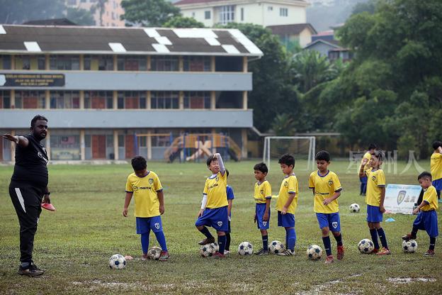 周日早上,蕉赖一间国小驶入一辆辆私家车。踏进校门,身侧的草场插满(Junior Football Academy Malaysia)的旗帜,数十名身穿黄色运动服的儿童聚集在草场中央,开始了每周2次的足球训练。