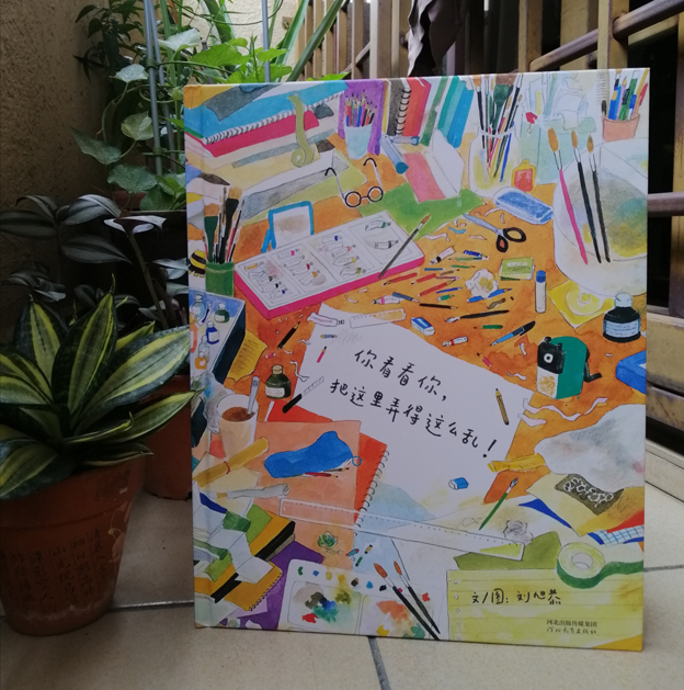 封面是凌乱的场景,撒了一地的水彩瓶子、画笔、文具和画纸,还有一幅画家的眼镜!“这还真的有点儿乱!”小禹笑着摇头。我说是呢!有时候创作大概很难做到很整齐,有时候灵感来了,乱一点是被允许的?