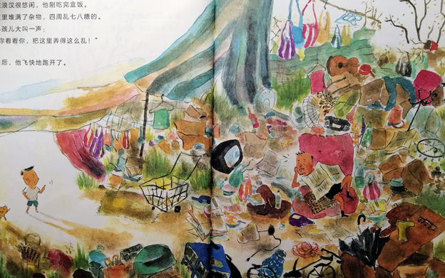 故事的最后,总统先生和部长一家人,还有流浪汉一起在草地上野餐。大家吃饱喝足,地上却都是果皮和油腻餐具,乱七八糟!这时,远远的,来了一位清洁工人……大家一起收拾干净了!