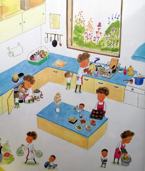 在这么乱的厨房中间,站着一位很忙的妈妈。她在准备晚餐,她的孩子在地上推开了一卷吸油纸,但奇怪的是那位下班回到家的父亲,看到凌乱场景,满是怪责与不满,却没有上前抱起孩子,而是转身“逃离现场“,这会不会是部分家庭的现实写照?