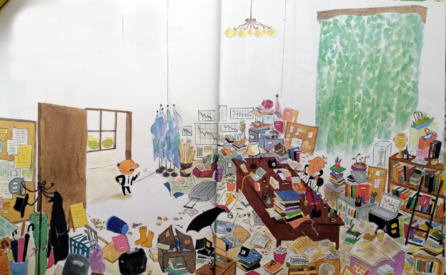 故事开始了,是坐在洁净明亮的办公室里的总统先生!这总统先生坐着觉得很无聊,决定去部长办公室看看。来到部长办公室,我的天!办公室里简直像是刚打完战!桌上堆满文件,桌子周围都是散开来的书,桌子底下还有四散的纸张,乱七八糟!“都没有路走了!”小禹感慨。