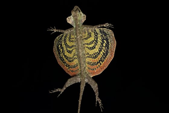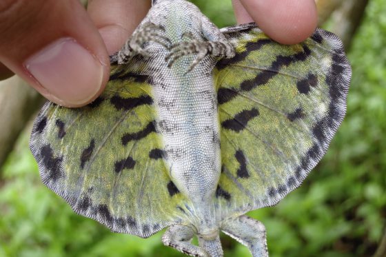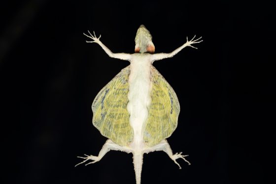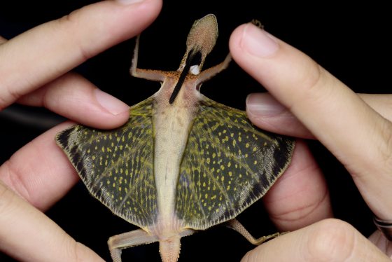 顾名思义是会“飞”的蜥蜴,而Draco指的就是Dragon。确切来说,飞蜥不是用翅膀飞,而是用皮膜(patagium)滑翔(gliding)。它的皮膜是从肋骨延伸出来,连着皮展开。