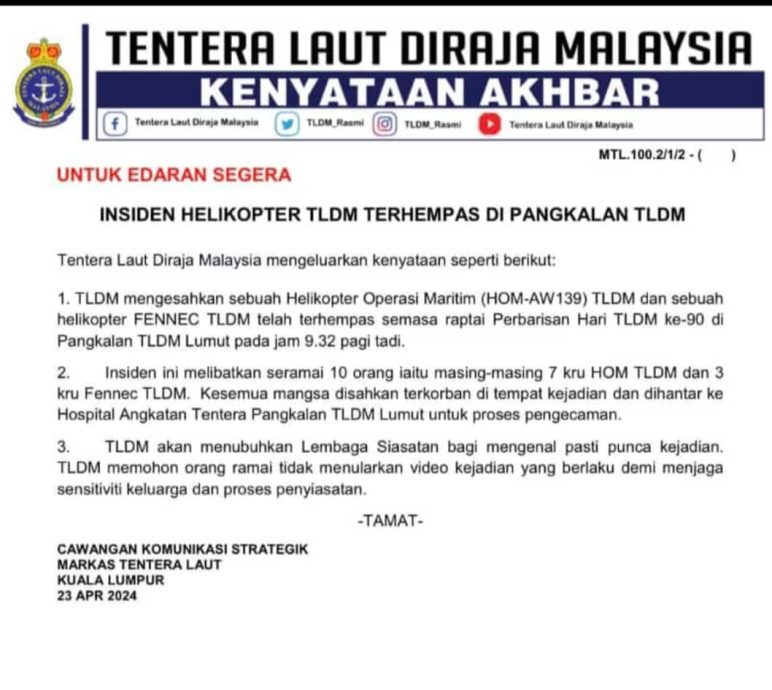 首相拿督斯里安华向所有在坠毁直升机事件中失去亲人的家属致以哀悼,并指示国防部进行全面的调查!(点阅全文)