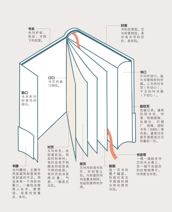 书一般由封面、封底、书衣、书腰、扉页、目录、正文、书签带、辅文(前言、后记、引文、注文、附录、索引、参考文献)等部分组成。