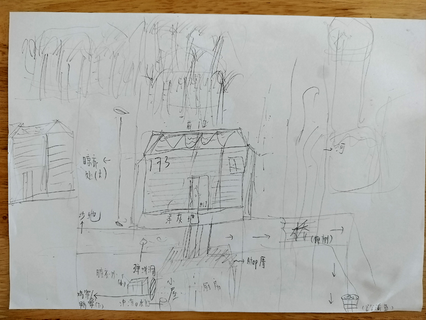 妈妈谈起小屋的时候,回忆起自己和二姐的互动,脸上挂着幸福的微笑。她和二姨围着纱笼在冲凉房洗澡和洗衣服。屋外养了家畜,她俩洗了澡,二姨负责晾衣服,妈妈负责喂养鸡鸭。小屋和173之间以沙地连接,公公为了不让妻儿淋雨,在两房的屋顶悬置一张塑料袋。穿到后门,妈妈唤舅舅玩玻璃弹珠,沙地留下大大小小的玻璃弹珠坑。