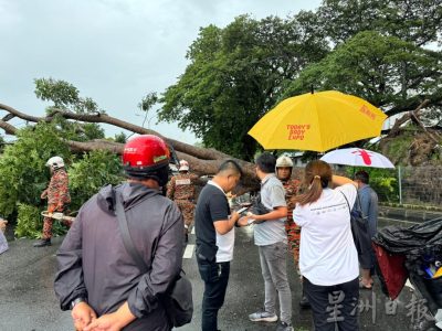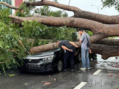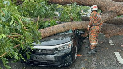 北海今早刮起的强风,将红毛井路旁一棵大树连根拔起,巨大的树干轰然倒下,压中停在交通灯前的一辆轿车,所幸车内的林氏华裔夫妇被路人从车内拉出,及时逃出生天。