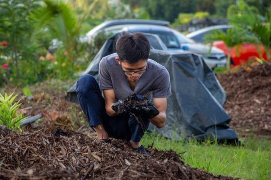“我们每天处理400到600公斤厨余,生产100到200公斤堆肥。处理方法是将厨余与落叶和碎木混合。由于绿色材料需要与棕色材料搭配,在适当的碳氮比下,堆肥的过程会加速。如果顺利的话,3个星期就能转化为肥料。在此过程中,我们需要定期检查通风、湿度和温度。如果这3项条件偏离标准,堆肥的过程就可能会失败,厨余可能会变得更酸,甚至发臭,或需要更长时间才能变成堆肥。”