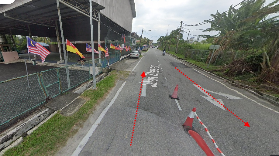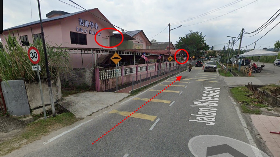 家属推测小凯欣是在这路段被撞后,飞抛到篮球场和警局之间的马路上。(脸书截图)