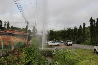 水管在事故发生后破损,水柱从管道喷射出来,形成一座喷泉。