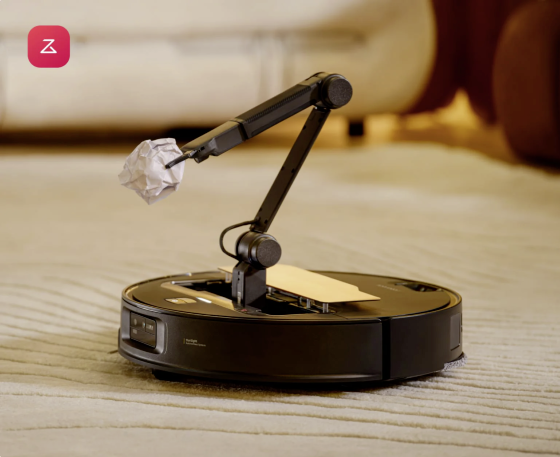有关机械手臂是隐藏在扫地机器人的顶部,并拥有五轴折叠设计,可以像人的手臂一样灵活。这条手臂长度约30厘米,在末端配备了夹子、摄像头和LED灯,并结合AI影像辨识技术,能够精准识别多达108种常见物品。