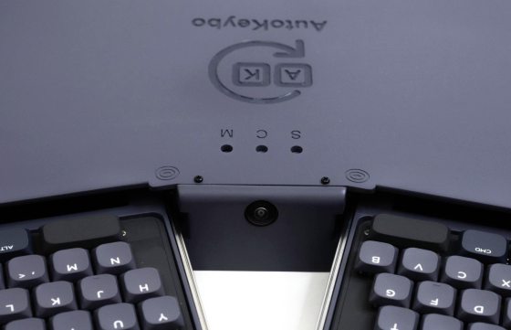 整个键盘连接着一个类似手托的电子装置,而在装置的中间有一个AI手势感应摄像头。在全自动模式下,当你打字打到一半,想要用滑鼠,只需轻轻抬起右手,键盘便会自动将字母键盘收起,然后弹出触控板。如果采用半自动模式,你就需要用拇指按下弹出按钮,才能让触控板弹出来。