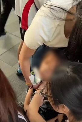 数名相信是该校学生的女子,正用纸巾或卫生棉等物品,用力捂住其伤口,试图为她止血。