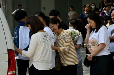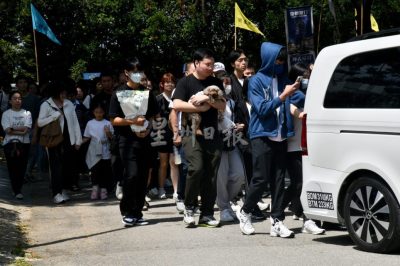 灵柩车缓缓驶向火化场期间,在车后扶灵的死者母亲难掩悲痛之情放声大哭,父亲则神情没落地相伴在旁安慰,场面哀戚;近百名亲友亦尾随在死者双亲之后,其中一人怀里抱有灰色小型犬,至于其他多名友人则各持花束,为死者献上最后祝福。