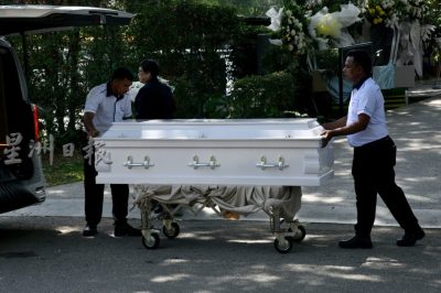 据记者观察,死者亲友自今早相继抵达位于沙亚南富贵生命馆的灵堂,在进行基督教唱诵诗歌仪式后,于11时30分举殡,放有多束由亲友送上花束的纯白棺木缓缓推上灵柩车。