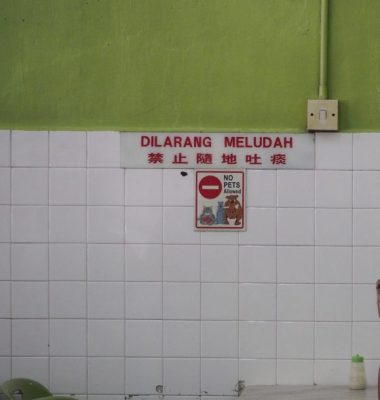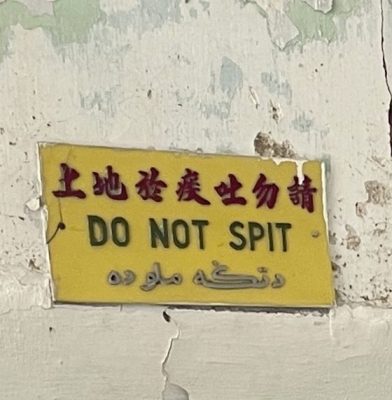我见过最多的警语是“禁止随地吐痰”,这告示牌分布西马各地,从玻璃市、槟城、安邦、太平都有,说明各地都有人吐痰;华文的排列还是由右至左的繁体字,由此可推测该警语存在于1980年前,80年代后就逐步推行简体字了。再来是语言,同时标示华文、英文、马来文、淡米尔文,甚至我还见过写爪夷文的,可见吐痰这事不分种族。