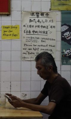 还有店家的警语,恰好写上年份:“2017年起,本店不提供手提塑料袋,请顾客自备环保袋!!”由此可知,此时环保议题开始受到重视,政府实行的减塑措施已经普及到小吃店了。