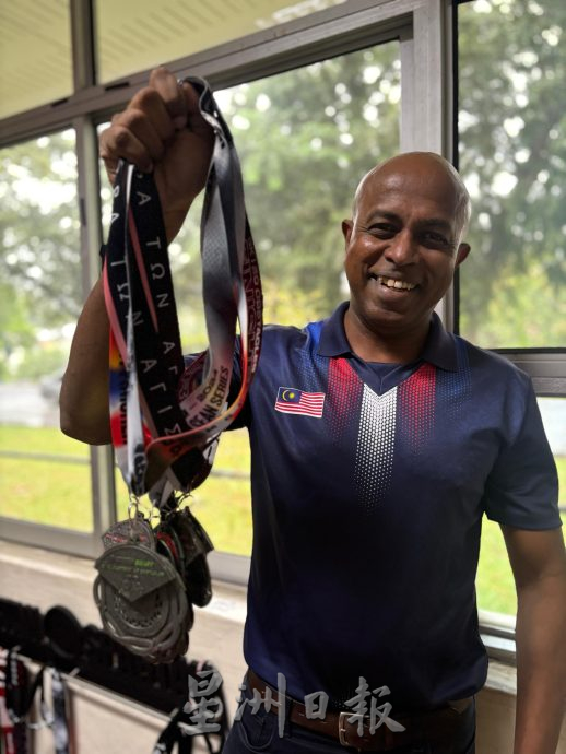 热衷于斯巴达障碍赛的西瓦穆鲁甘展示其所获奖牌,并指出,通过运动可清楚看见跨族群间的互助精神,而这也是一种爱国主义的具体体现。(黄雨云摄)