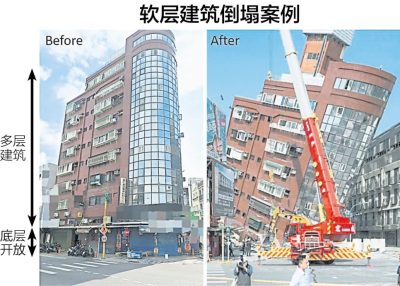 他说,当地震发生时,地面的开放层会承担大部分侧向变形,远大于上部楼层,这往往就是倒塌的起点;即便是中等强度的地震,也可能对这种薄弱的楼层造成严重破坏。