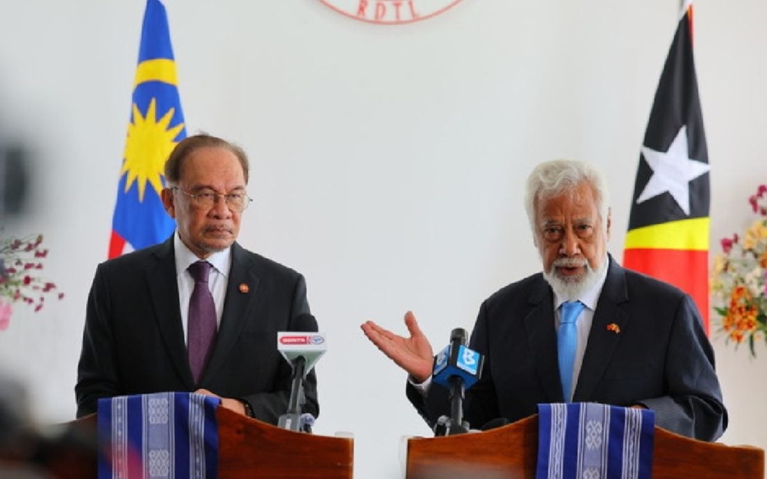 廖朝骥认为,东帝汶的加入象征东盟区域整合更进一步,并不会让协商更复杂或破坏以共识为基础的运作模式;图中人物为安华和东帝汶总理古斯茂。(马新社照片)