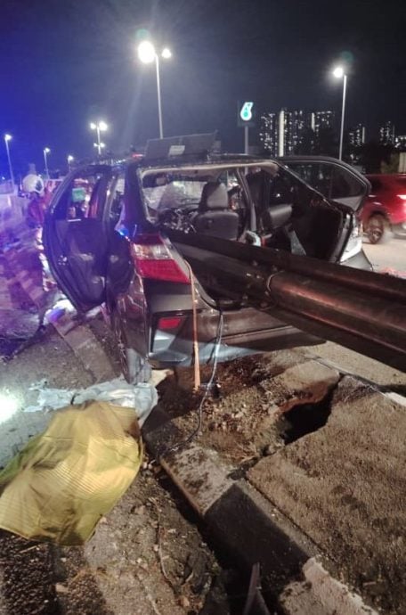 防护栏插入车身,导致车内乘客受伤,其中一名女乘客因此伤重丧命。(消拯局提供照片)