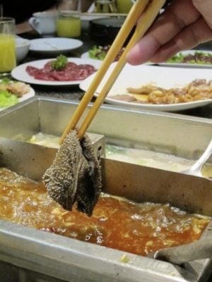 直到十多年前到成都采访,造访当地麻辣锅名店皇城老妈,想到终于有机会朝圣麻辣锅原产地,才发现跟我吃过的大不同!首先是翻开菜单,食材非常生猛,好像进入动物园,一时不知如何点才好:兔腰、黄辣丁、千层肚、猪黄喉。“兔腰”指的是兔肾,我少有机会吃到兔肉,更何况兔肾,而且还串成像糖葫芦。“黄辣丁”是指当地的一种河鱼。“千层肚”牛的重瓣胃,平常吃的毛肚是牛的瘤胃,口感前者柔软、后者爽脆。“猪黄喉”的黄喉指的是猪的主动脉血管。