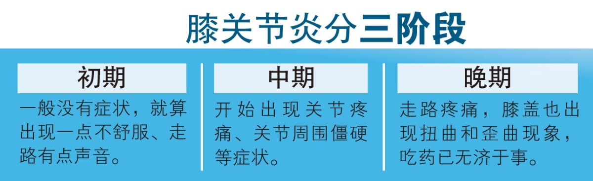 苏医生指出,膝盖关节炎一般分成三个阶段,初期、中期和晚期。初期病人一般没有症状,就算出现一点不舒服、走路有点声音,患者也不以为意,普遍上不会求医。到了中期开始出现关节疼痛、关节周围僵硬等症状后,患者才开始寻求医生帮助。