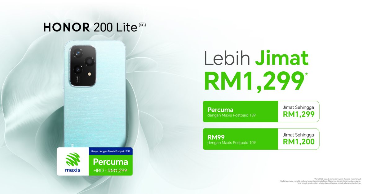 现在只需与运营商签购为期两年的后付配套(Postpaid plan),即可以每月最低RM68,将HONOR 200 Lite免费带回家!