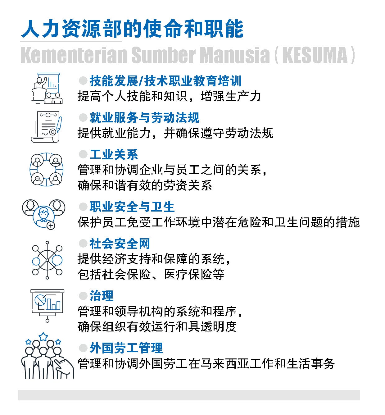 技能发展局负责加强技职培训教育的治理,增强马来西亚技能认证制度和扩大技职培训补贴。
