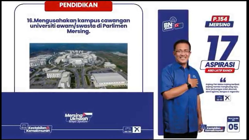(新山16日讯)竞选期进入倒数两天,丰盛港国席国阵巫统候选人拿督阿都拉迪夫班迪公布17项竞选宣言,承诺一旦中选将为丰盛港人民带来改变,包括引进大专学府分校进驻丰盛港,并通过公立和私立教育提升国民竞争力。