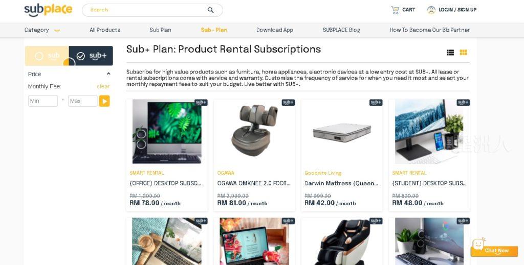 SUBPLACE一共有两种订阅模式,分别为「SUB」和「SUB+」。「SUB」是订阅一般日用品和服务;「SUB+」是租赁家具、健身器材、家电用品和电子产品。订阅和租赁是两种不同的概念,前者是随时可以取消订阅,没有任何合约羁绊和隐藏收费;后者有合约条款限制,不能随意退订。