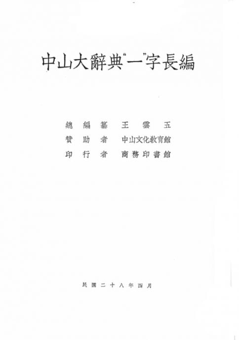 当时孙科向他建议“编纂一部空前之大辞典”,于是模仿《牛津英语词典》的规模编辑《中山大辞典》,计划收6万单字、60万辞语、共5000万字,终于在1939年出版了第一部《中山大辞典一字长编》,也就是只收集了第一个字“一”的全部内容,包括了5474词条,约100多万字共478页。