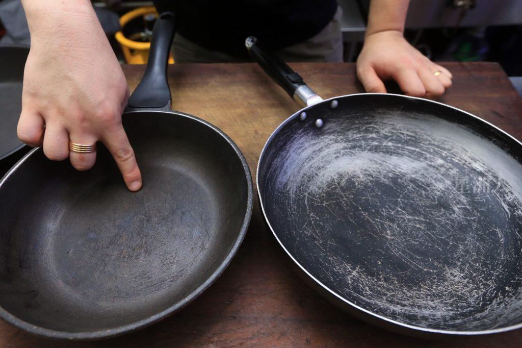 不粘锅是有寿命,长年累月一直加热冷却,锅内涂层会自然脱落。无论陶瓷涂层、特氟龙涂层,其耐用度皆不会超过2年。目前,绝大部分不粘锅采用特氟龙涂层,特氟龙又名为聚四氟乙烯(PTFE)。他从桌上随手挑起一个“伤痕累累”的不粘锅,肉眼一看,内部早已布满刮痕,涂层已损耗殆尽。他解释,廉价的不粘锅仅有一层(layer)涂层,经不起厨师的“摧残”。倘若预算充足,避免购买品质低劣的不粘锅。“其实越便宜的不粘锅,寿命越短,变相要换得更频密。如果长期使用,最多耐3个月。相比优良品质的不粘锅,锅面有超过5层涂层,耐用程度可达一年。”