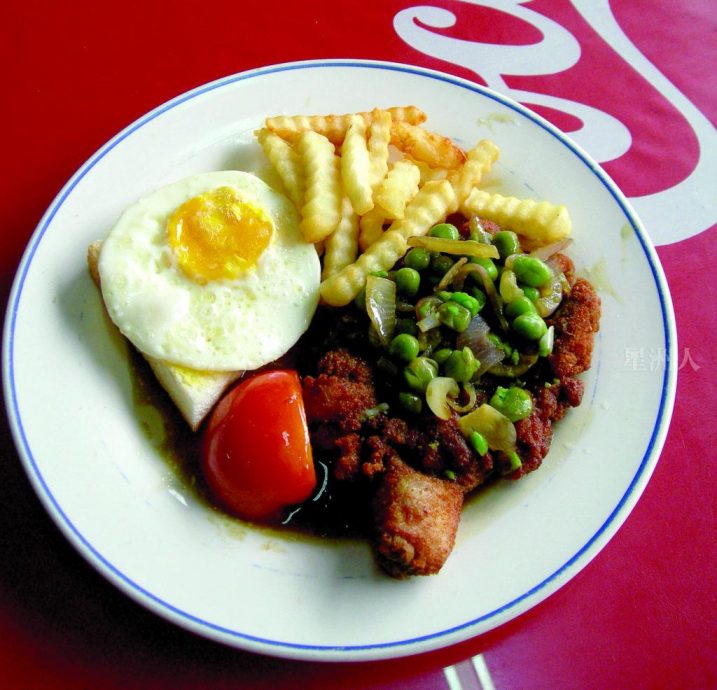 一般西式肉扒是用炭火烧烤,而海南鸡扒则沾上蛋液或直接油炸,同样淋上从洋人那里学来的蘑菇酱汁或自创的蚝油浓芡、青豆洋葱、烧烤蕃茄,当然不忘配上大把炸薯条,便成了一道星马独特的海南西餐经典。