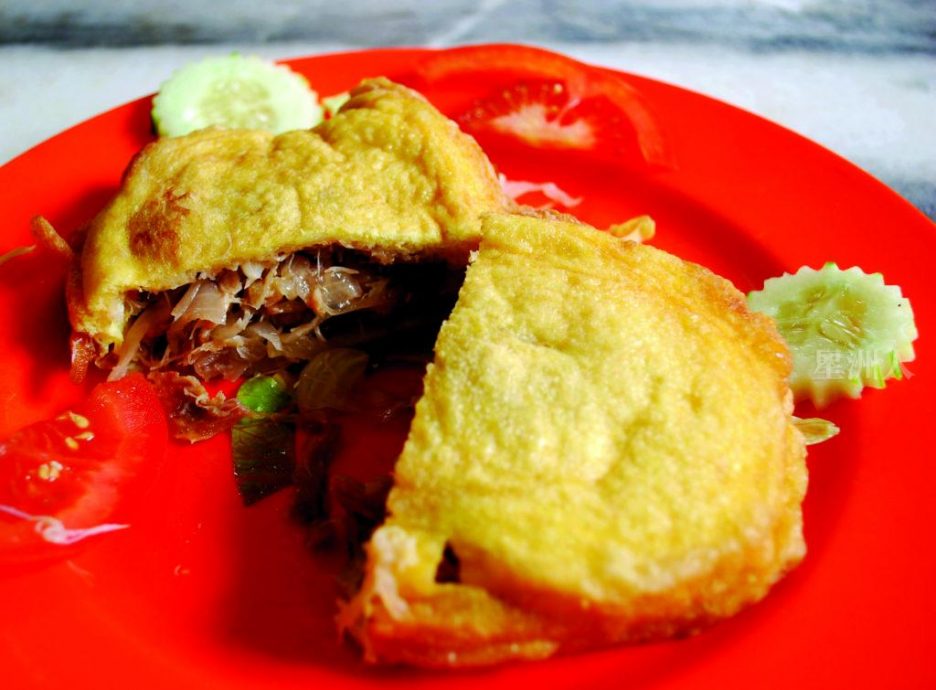 Roti Babi是什么东东?说穿就是厚片吐司面包,一侧切缝,酿入猪肉、螃蟹丝、生菜及洋葱等炒成的馅料,再沾上蛋液油炸而成。碟中饰有蕃茄、黄瓜和生菜等,以咭汁(Lea & Perrins)和黄芥末为沾酱,吃时弄刀弄叉,一派吃西餐的模样。