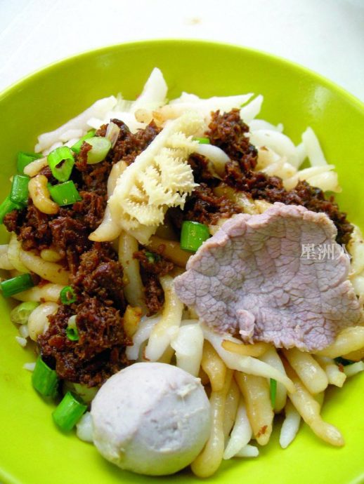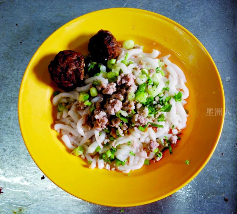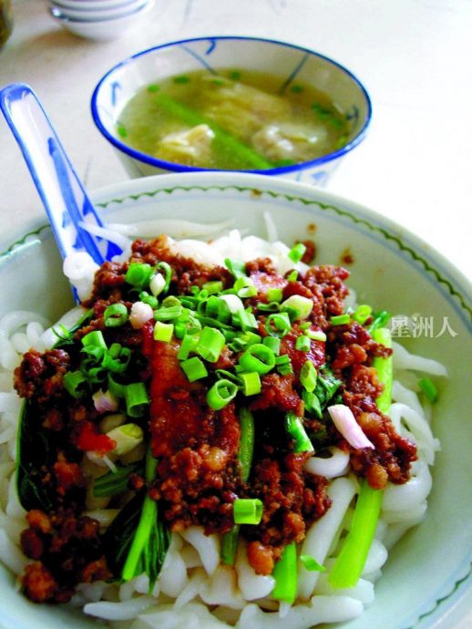 姐妹档所使用的老鼠粉,同样出自半山芭“致禄”的手,父亲沿用几十年,杨女士感慨一旦致禄退休了,也不晓得哪裡才能找到如此百分百纯米的手工老鼠粉了。我喜欢肉碎老鼠粉,肉碎以不掺入黑酱油为大埔特色,烫熟的老鼠粉加入熟油、鱼露、肉碎、青葱,以及画龙点睛的炸蒜头碎,另加两粒酿蚝豉,便成为乡土得教人想哭的美味。