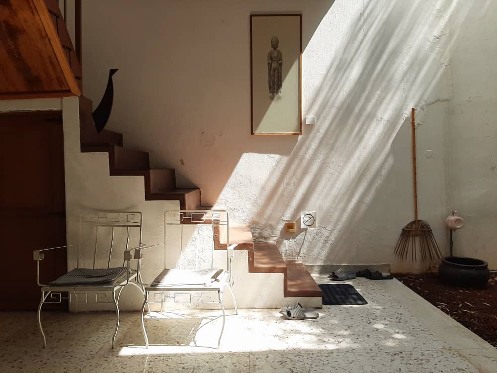 除了还原天井,何国荣尽量在保持房子原有模样的基础上整修,因此他们只是加固厚重的木门、为木质的地板和房顶的木条去除白蚁并加以修缮稳固,还留下一节相对完好的木条,改成木凳子,放置在何国荣最爱的天井边。