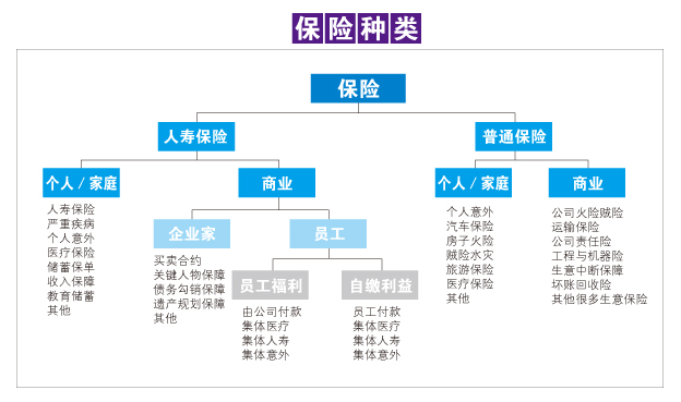 简单来说,若以人的生命投保,多数为人寿保险;以产业或财产投保的话,个人意外及医疗保险除外,多数是普通保险。同时,如果保险的保障利益归于个人或家庭,属于个人或家庭范围;若保障利益归于公司,就属于商业用途的保险。