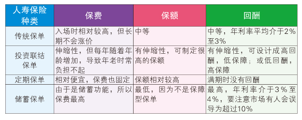 而市场上的人寿保险大略分为4种,有传统保单、投资联结保单、定期保单和储蓄保单,每种保单都有各自的利与弊。