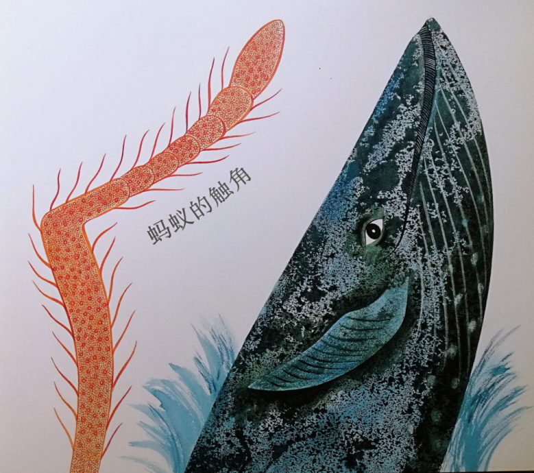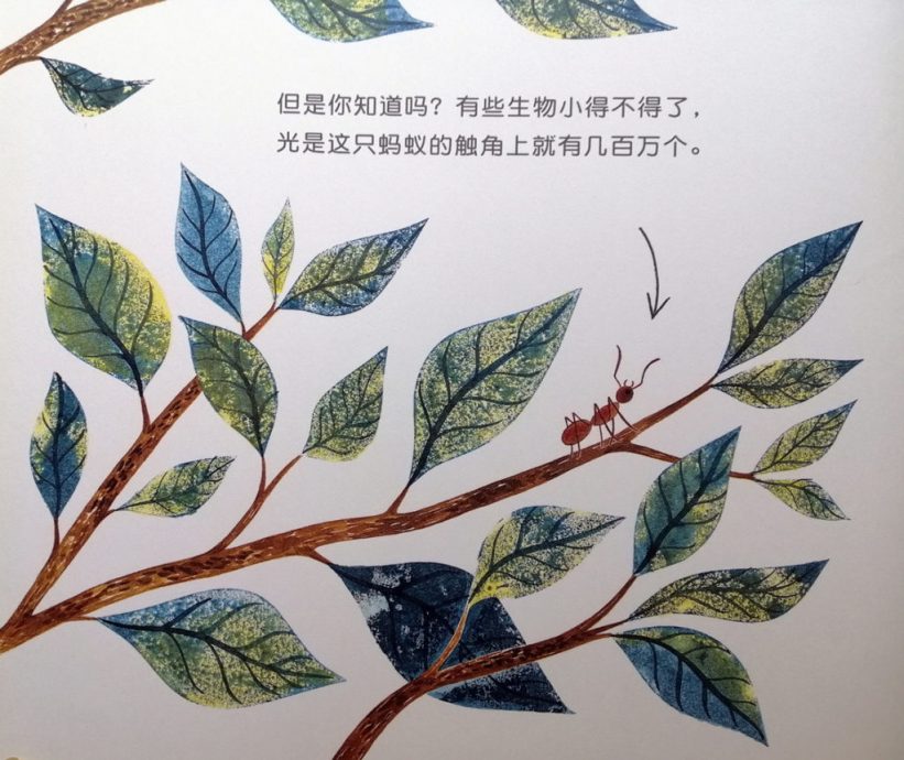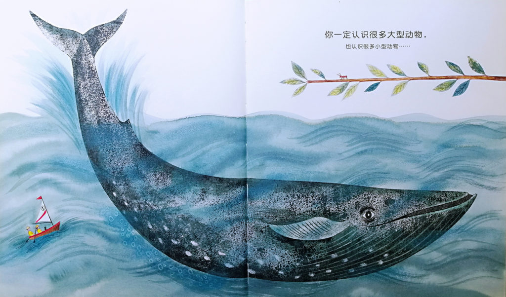 一翻开主页,就很惊喜了!是一只跨页的大鲸鱼!“你一定认识很多大型动物,也认识很多小型动物……”读了这句,我们很快就发现了枝叶上有只小蚂蚁!这是多有趣的对比──最大比最小。但是再翻页,我们就知道错了,一个小箭头指着小红蚂蚁的触角: