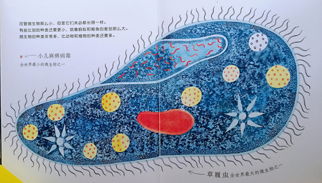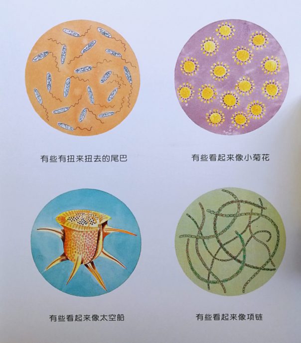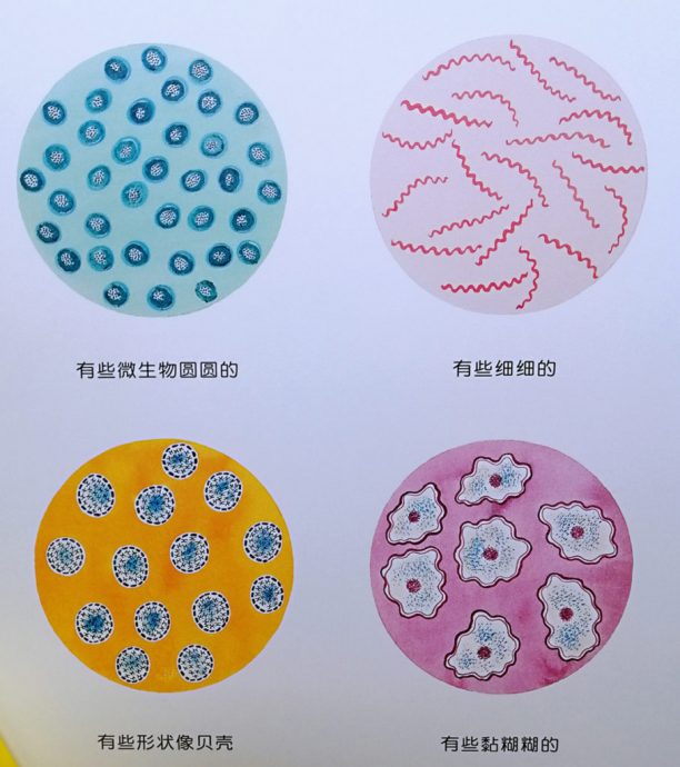 我假意问:“你们说,微生物会不会跟人一样有头有眼睛鼻子嘴巴?”阿哥大笑:“什么头?”阿妹说:“马麻你中学读过的都忘了啊?微生物就一个圆形或条形啊!”我说这绘本真是好,里面就说了:“这些微生物没有眼睛,没有头或脚,他们不是动物也不是植物,但它们是活的!”