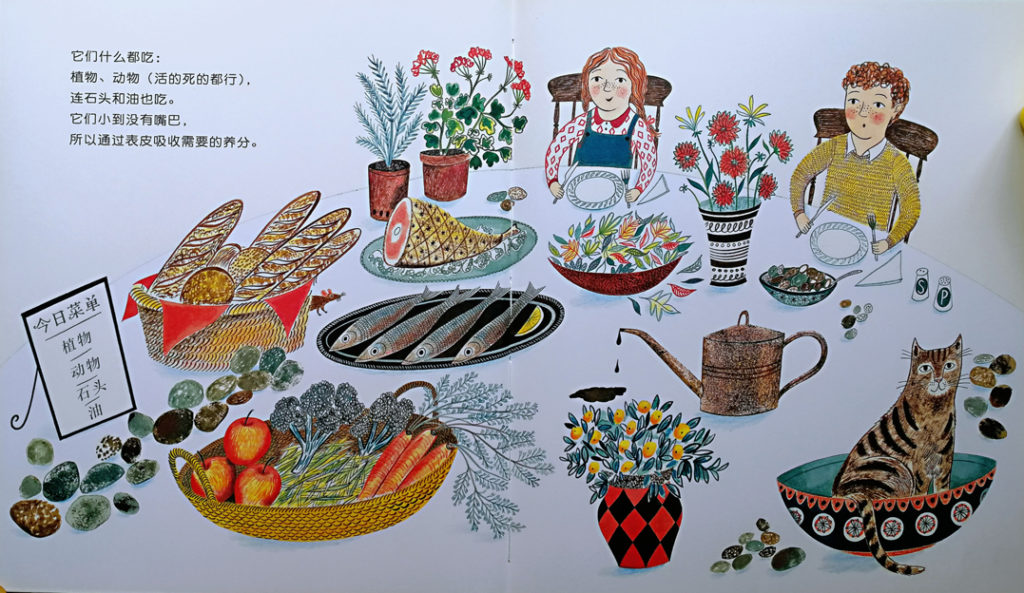 有些微生物圆圆的,有些细细的,有些形状像贝壳,有些黏糊糊的,有些有扭来扭去的尾巴,有些看来像小菊花,有些看起来像太空船,有些看起来像项链……它们什么都吃:植物、动物(活的死的都行),连石头和油都吃!它们小到没有嘴巴,所以通过表皮吸收需要的养分。