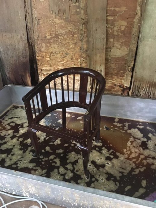3. 用阿参水涂抹整个家具,静置两三个小时后用清水冲洗。风干后,依据家具的受损问题来一一修复。
