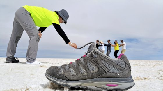 盐沼有水时,呈现的是一大片镜子般的大地;盐沼无水时,六边形盐晶无穷无尽地重复,广阔荒凉、白得耀眼。漫步在这里,犹如站在一个巨大的镜面上,浸没在纯白的世界里,你会彻底被这令人窒息的美丽折服。置身其中,前方望不尽边缘,触目所及,只有蓝色和白色的倒影。