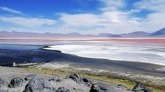 第二天日出后出发,一路看沙漠、火山、高山盐湖。一个又一个的盐湖(laguna),因湖中的矿物质和植物,在不同的季节释放不同的色泽,造就了laguna别具一格的颜色,加上湖中成群的红鹤,为这个特别的景观增添色彩。