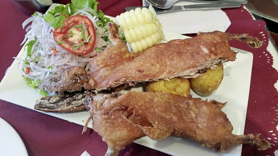 Cuy(天竺鼠/豚鼠/Guinea pig)在一些地方被养为宠物,但在安第斯高原,这是一道家喻户晓的美食。它虽然貌似老鼠,但不是老鼠也不是猪,西班牙语称为cuy,通常是整只拿来炸或烤,肉质和味道都很棒。